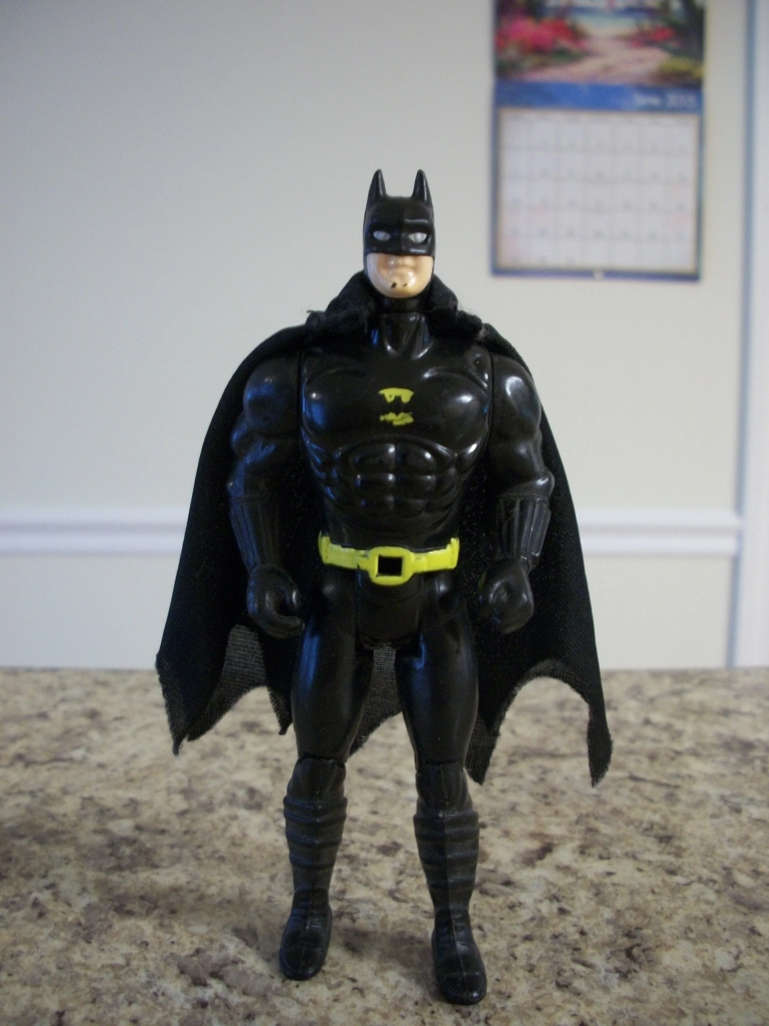 That is the Batman figure produced by Toy Biz in conjunction with the release of 1989's Batman. It's one of the first action figures I ever owned, and definitely an early manifestation of my life-long obsession with Batman. He's a little worse for wear now (he has survived over twenty years, now, and got played with A LOT! I even remember his bat-rope belt breaking when I still had a crib, or maybe just a side-rail on my big-boy bed to keep me from rolling out. Which was it? Oh well. The point is, I was very upset!) but over all, he's still a good figure. Seven points of simple articulation (head, shoulders, hips and legs, all simple pivot-joints) and five inches tall, a pretty basic figure by later standards, but definitely the beginning of the amazing figures to come. (By the way, I'll be using Batman figures as points of reference a lot in this article simply because I own more of them than I do any other type of figure, most of them manufactured by different companies. But fear not, the points I make do apply to pretty much all figures across the board, with a few exceptions I'll discuss later. Still, I will try to use other characters from other companies when possible for posterity.)